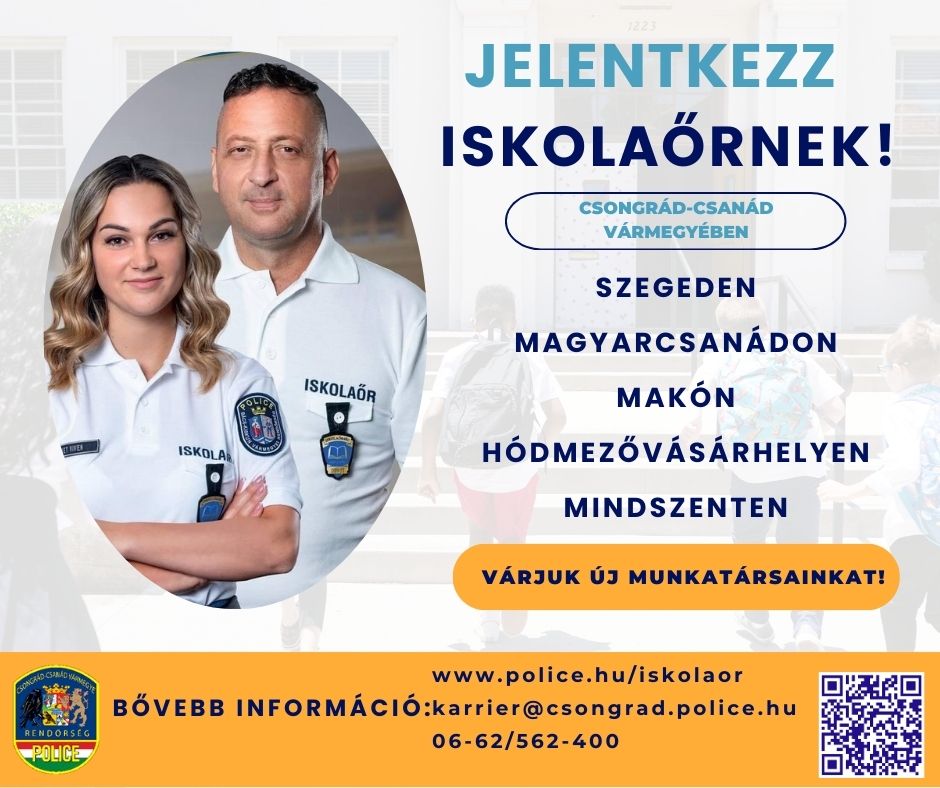 Újabb intézményekbe várja a Csongrád-Csanád Vármegyei Rendőr-főkapitányság a leendő iskolaőrök jelentkezését: Makóra, Szegedre, Hódmezővásárhelyre, Mindszentre és Magyarcsanádra is keresnek ugyanis iskolaőröket.