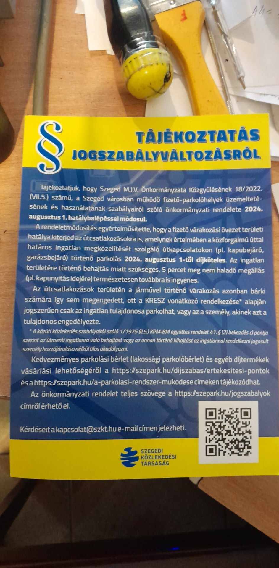 A fent is említett okokból osztogatnak most szórólapokat, melyen leírják, hogy jogszabályváltozás történt, így a kapubeállók és garázsbejárók is díjkötelesek lesznek, ám az 5 percet meg nem haladó megállást továbbra is ingyenes.