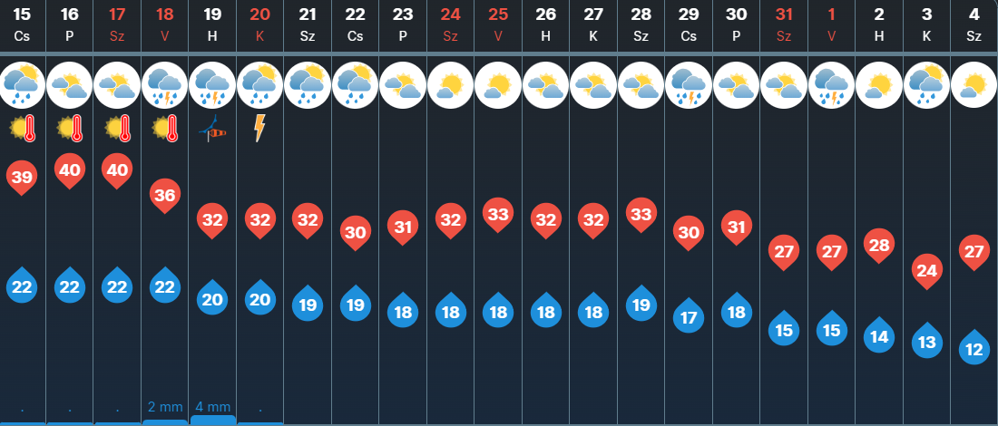 Pénteken sok napsütésre számíthatunk, és csak néhol alakulhat ki futó zápor, esetleg zivatar. A szél csak záporok, zivatarok környezetében támadhat fel. Folytatódik a hőség, 34-41 fokot mérhetünk a legmelegebb órákban.