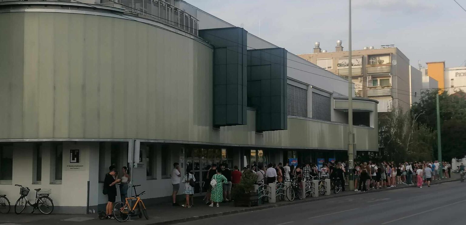 Szeged SZIN-esedik: kígyózó sorokban állnak a fesztiválozók a karszalagokért az Ifjúsági Ház előtt