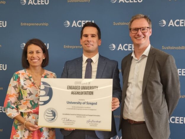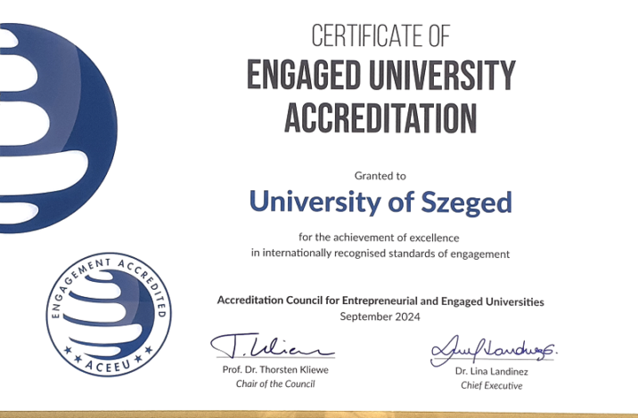 A Szegedi Tudományegyetem Magyarországon elsőként nyerte el az ACEEU nemzetközi szervezet „Engaged University” (elkötelezett egyetem) minősítését. Az intézmény társadalmi szerepvállalását elismerő tanúsító oklevelet 2024. szeptember 19-én adták át az ACEEU Europe-Africa Forum rendezvényén. Ezzel az egyetem újabb jeles eredményt ért el a szűkebb és tágabb környezete iránti elkötelezettsége, felelősségvállalása terén, tudatta szerkesztőségünkkel az intézmény.