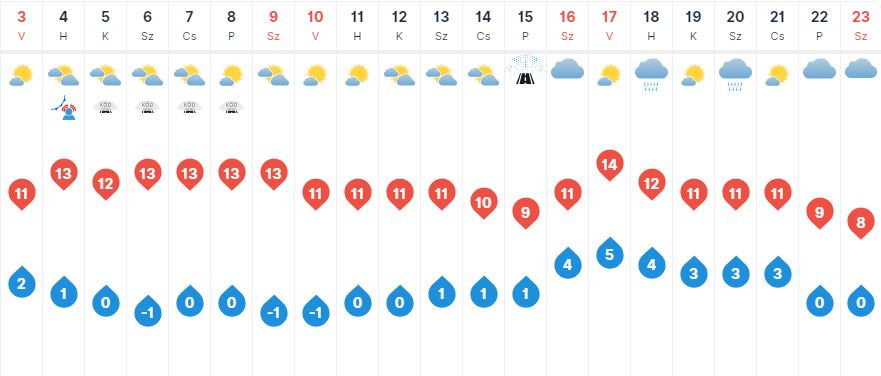 Vasárnapra megérkezik a lehűlés, többfelé megjelennek a hajnali fagyok, délután pedig csak 7-12 fokot mérhetünk Szegeden. Többnyire napos-fátyolfelhős idő várható csapadék nélkül. Az északi, északkeleti szél a Dunától keletre még többfelé élénk lesz.