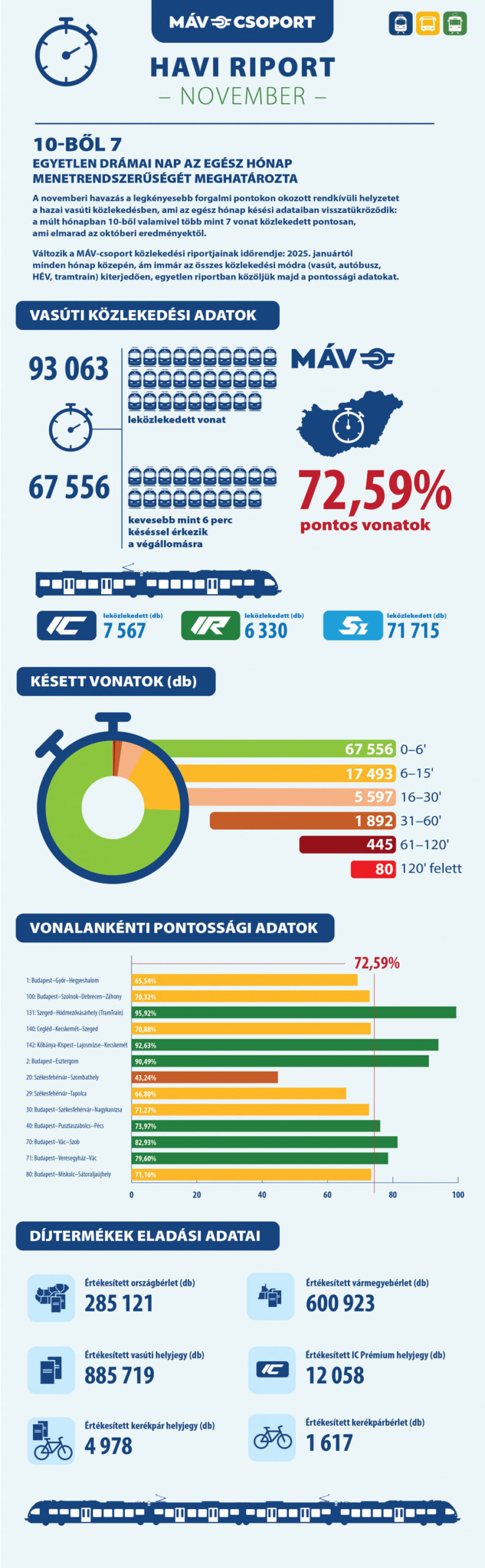 A MÁV legfrissebb, vasárnap közzétett jelentése szerint novemberben a vonatok valamivel több mint 70 százaléka közlekedett pontosan, ami az októberi teljesítményhez képest visszaesést jelent – derül ki a MÁV-csoport november havi riportjából.