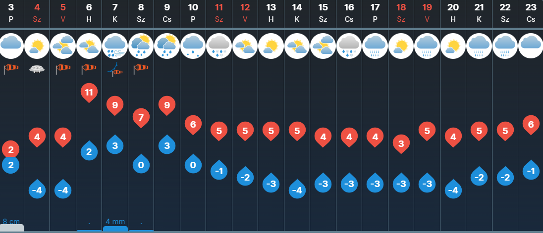 Péntekre virradóra többfelé várható eső, zápor, helyenként havas eső, havazás, kisebb ónos eső, majd reggel dél-délkelet felé távozik a csapadék, és csökkenni kezd a felhőzet. Szegeden a hajnali órákban lehet majd csapadékra számítani. Napközben, miután elvonultak az esőfelhők akár egy kis időre kisüthet a nap is. Az északnyugatira forduló szél többfelé élénk, helyenként erős lesz. Kora délután 1 és 6 fok között alakul a legmagasabb hőmérséklet.