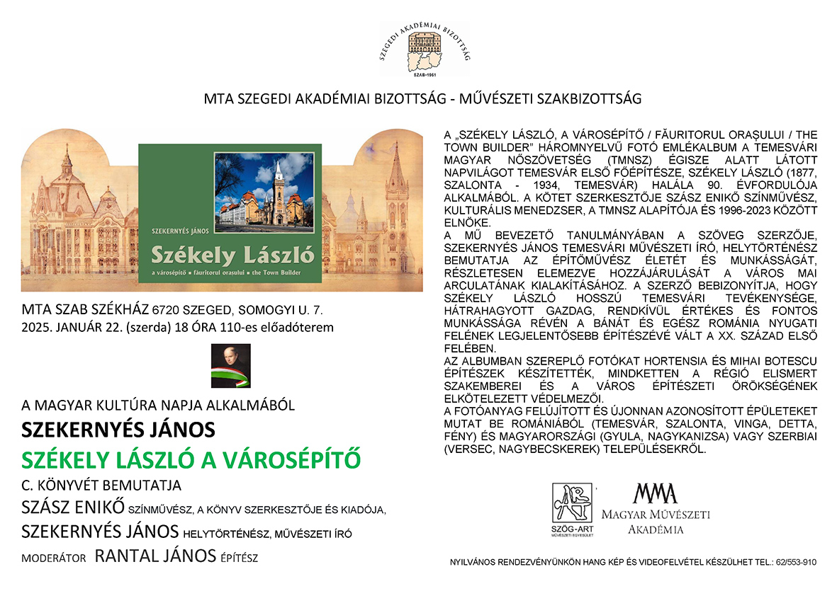 Temesvár főépítészéről szóló könyvbemutatóval ünnepli a Magyar Kultúra Napját a Szegedi Akadémiai Bizottság