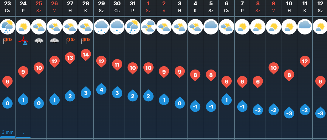 Pénteken már több helyen süthet ki hosszabb-rövidebb időre a nap. Kisebb eső, zápor a nap első felében még délen, délkeleten, keleten lehet, majd délután mindenhol eláll az eső. A nyugatias szél megélénkülhet, néhol erős lökések is előfordulhatnak. Napközben már 3-11 fokot mérhetünk.