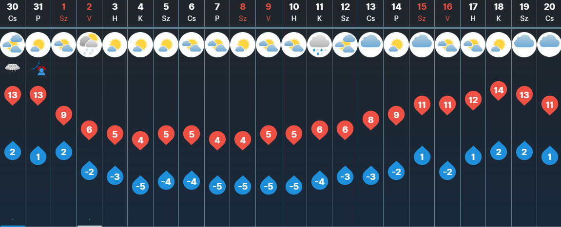 Csütörtökön ködösen indulhat a reggel Szegeden, majd délelőtt még felhősebb időjárásra számíthatunk. A megnövekvő felhőzet miatt gyenge eső és zápor is előfordulhat. Az előrejelzések szerint délutánra már csökkenni fog a felhőzet, és nap is kisüthet. Hajnalban 2, napközben pedig 13 fok körül alakul a hőmérséklet városunkban.