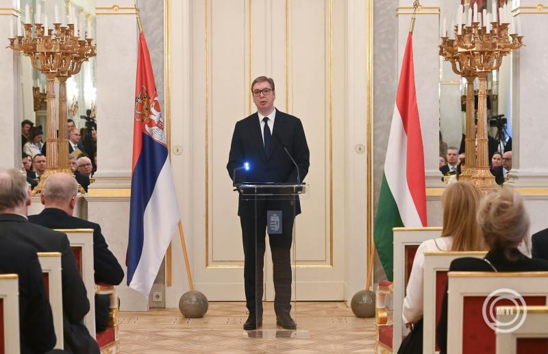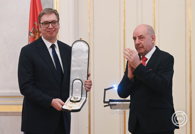 A Magyar Érdemrend nagykeresztje a nyaklánccal és az arany sugaras csillaggal kitüntetést adta át Sulyok Tamás köztársasági elnök hétfőn Aleksandar Vucicnak, a Szerb Köztársaság államfőjének. A Sándor-palota Tükörtermében rendezett ünnepségen Sulyok Tamás hangsúlyozta: sokszor észre sem vesszük, hogy az idő, amelyben élünk, történelmi jelentőséggel bír, és történelmi hatású tettekre is képesek vagyunk, mint a most kitüntetett szerb államfő.