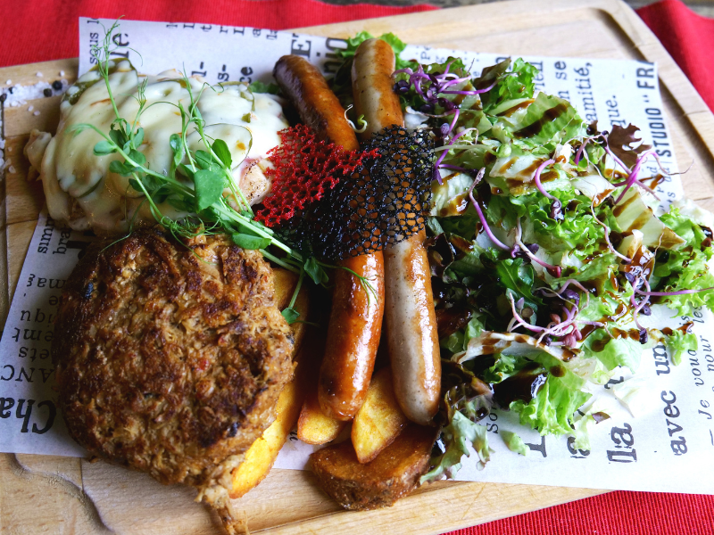 A tálon minden olyan íz ott van, amit egy kiadós lakomától elvársz. A grillkolbász roppan, a pulled pork olyan omlós, hogy szinte szétolvad a szádban, a jalapeñóval, baconnel és sajttal sült csirkemell pedig hozza azt a pikáns-füstös ízvilágot, amitől az ember elégedetten bólint. A steak burgonya kívül ropogós, belül puha, és ha az egészet egy friss, ropogós salátával kíséred, akkor az ízek tökéletes egyensúlyba kerülnek.