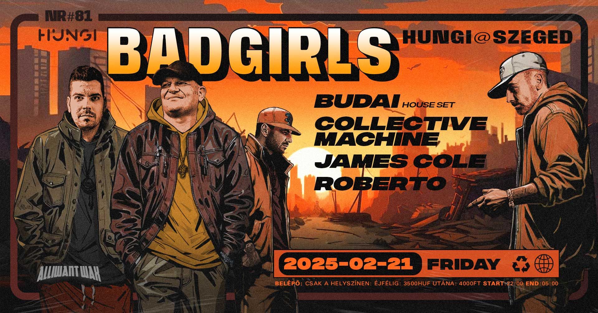 A szezont folytatva a Hungi nagytermében egy régen látott legendát köszönthetünk újra a dj pultban! Péntek este Budai Imi house szettel érkezik, így a Badgirls hangzáshoz illően a seggrazós deep és tech house énjéből kapunk ízelítőt. Ebben partnerei Collective Machine, James Cola és Roberto lesznek. Szombaton a klasszikus Hungis hangulat vár bennünket, dj Big Bill fogja pörgetni a lemezeket.