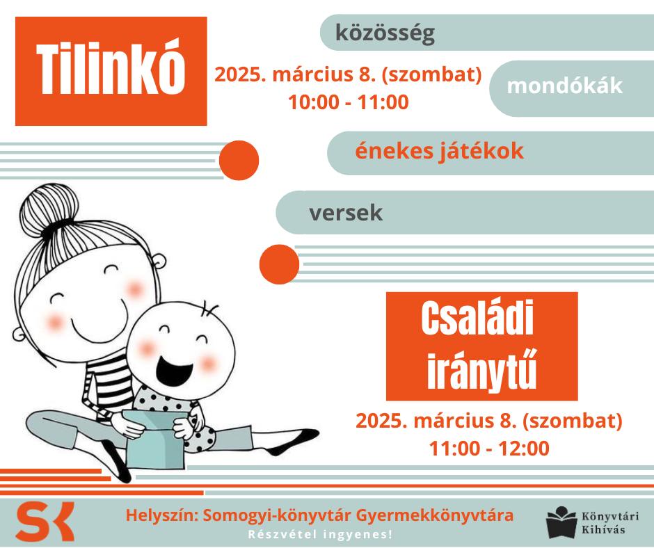 - Ugyancsak szombaton a fenti program előtt pedig a nagysikerű Tilinkó elnevezésű rendezvény veszi kezdetét 10 órától. A program keretében kisgyermekes szülők és gyermekeik részére népi gyermekmondókák, énekek, versek játékos összefűzésével derűs, vidám együttlétet kínálunk a Gyermekkönyvtárban.