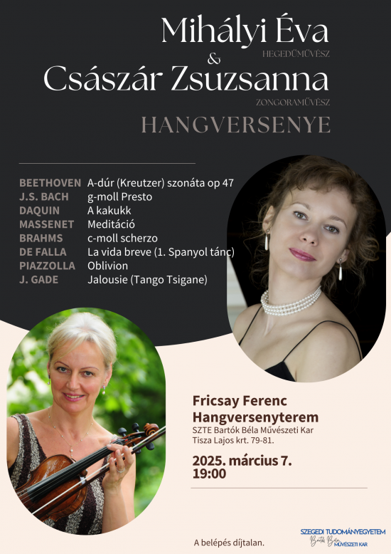 A Szegedi Tudományegyetem Bartók Béla Művészeti Karának kiváló művész oktatói, Császár Zsuzsanna (zongoraművész) és Mihályi Éva (hegedűművész) közös hangversennyel várják a klasszikus zene szerelmeseit. Az esemény péntek este 19 órakor kezdődik, az SZTE BBMK Fricsay Ferenc Hangversenytermében.