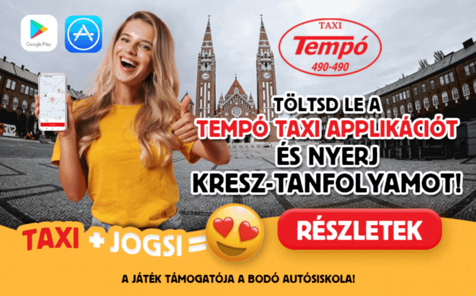 Szeged közismert taxitársasága a mostani nyereményjátékát leginkább a fiatalabb generáció figyelmébe ajánlja, mondván ők azok, akiknek még nincs KRESZ vizsgájuk. A nyeremény egyébként átruházható, tehát akkor sincs probléma, ha olyan lesz a nyertes, aki már rendelkezik KRESZ vizsgával. A Tempó Taxi kérése mindössze annyi, hogy aki szeretne részt venni a játékban, az írjon az applikációban használatos felhasználóneve mögé egy nagy T betűt, hogy némileg megkönnyítsék a munkájukat. A Tempó Taxi applikációt IDE és IDE KATTINTVA tudod letölteni, ha megvagy vele, rendelj egy taxit és zsebeld be Te az ingyenes KRESZ tanfolyamot!