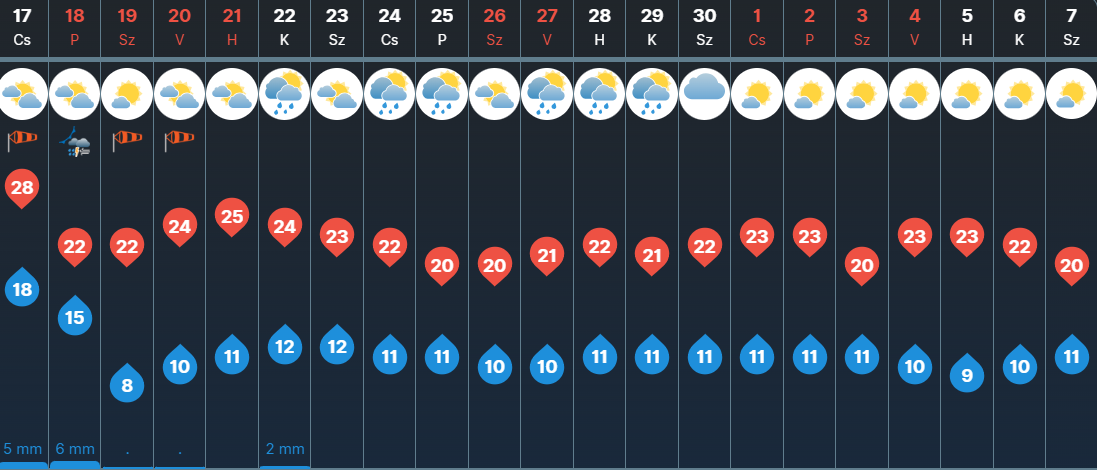 A dél felől érkező meleg légtömegnek köszönhetően csütörtökön sokfelé jóval az átlag felett alakulnak a csúcsértékek. Az ország nagy részén 24 és 29 fok közé melegszik napközben a levegő, viszont azokon a nyugati tájakon, ahová időközben megérkeznek a záporok, illetve egy-egy zivatar, ott délután több fokkal visszaesik a hőmérséklet. Azonban a Tiszántúlon a nap nagyobb része még túlnyomóan napos időt tartogat, és helyenként 29 fokot mutathatnak a hőmérők, de a jelenlegi számítások szerint elsősorban Gyula és Békéscsaba térségében akár 30 fok is lehet. Az Időkép szerint ha elérjük a 30 fokot, akkor az idei első hőségnapra is sor kerül.