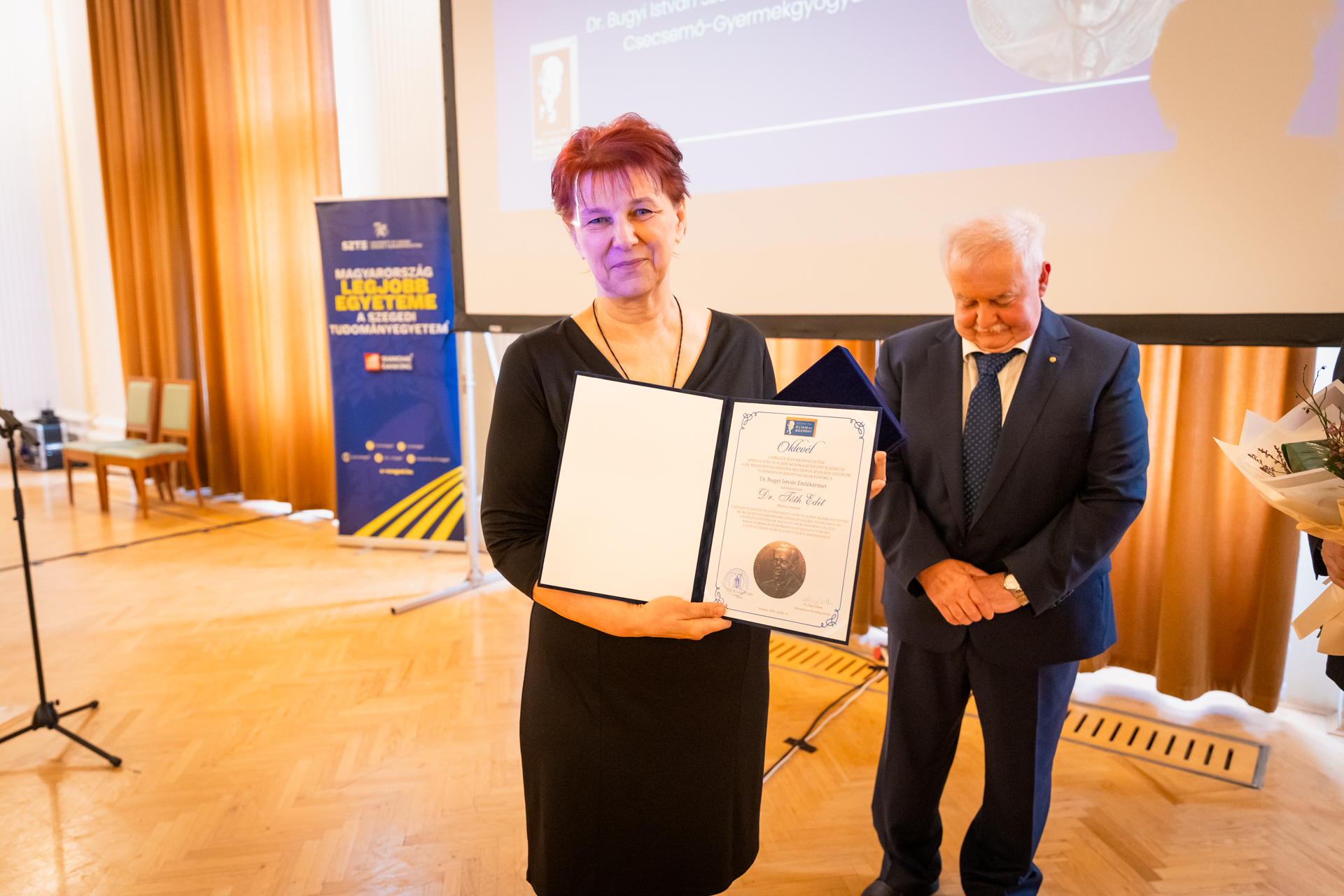 Az idén Dr. Tóth Edit főorvos, az SZTE SZAKK Dr. Bugyi István SZMC csecsemő és gyermekosztályának vezetője vehette át az életműdíjat Prof. Dr. Lengyel Csabától, az SZTE Szent-Györgyi Albert Klinikai Központ elnökétől, Dr. Sümegi Viktóriától, az SZTE SZAKK orvosigazgató-helyettesétől, az SZMC centrumkoordinátorától és Dr. Papp Zoltán főorvostól. Mint kiderült,