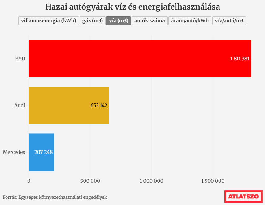 Ez autónként 1,25 köbméter vizet jelent, szemben a BYD autónkénti 6 köbméterével. Áramból 45 százalékkal kevesebb kellett egy autóra vetítve a Mercedesnél, mint amivel most a BYD környezethasználati engedélye számol.