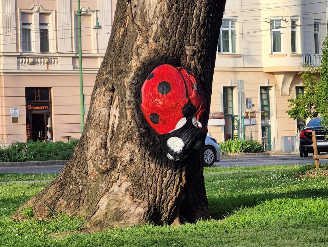 Ahogy 10 éve, úgy most is Dugonics téren a parkoló autókat figyeli a fára festettbogár. Azóta is sokan megnézik maguknak, és szívesen készítenek a katicával képeket. Reméljük, még sokáig lesz ékes dísze városunknak!