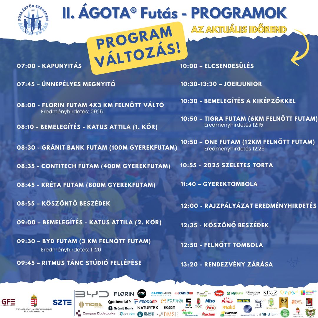 A Szeged365 tavaly is ott volt, amikor először futottak együtt több mint ezren azokért, akiknek a legnagyobb szükségük van a közösség szeretetére. Idén még magasabbra tette a lécet a II. ÁGOTA® Futással a három főszervező: A kormányhivatal és a két szegedi egyetem jótékonysági rendezvényén nemcsak futóverseny lesz, hanem egy igazi tavaszi városi fesztivál, amelynek minden momentuma értéket képvisel. Mert futni jó – de együtt futni, egy jó ügyért, felejthetetlen.