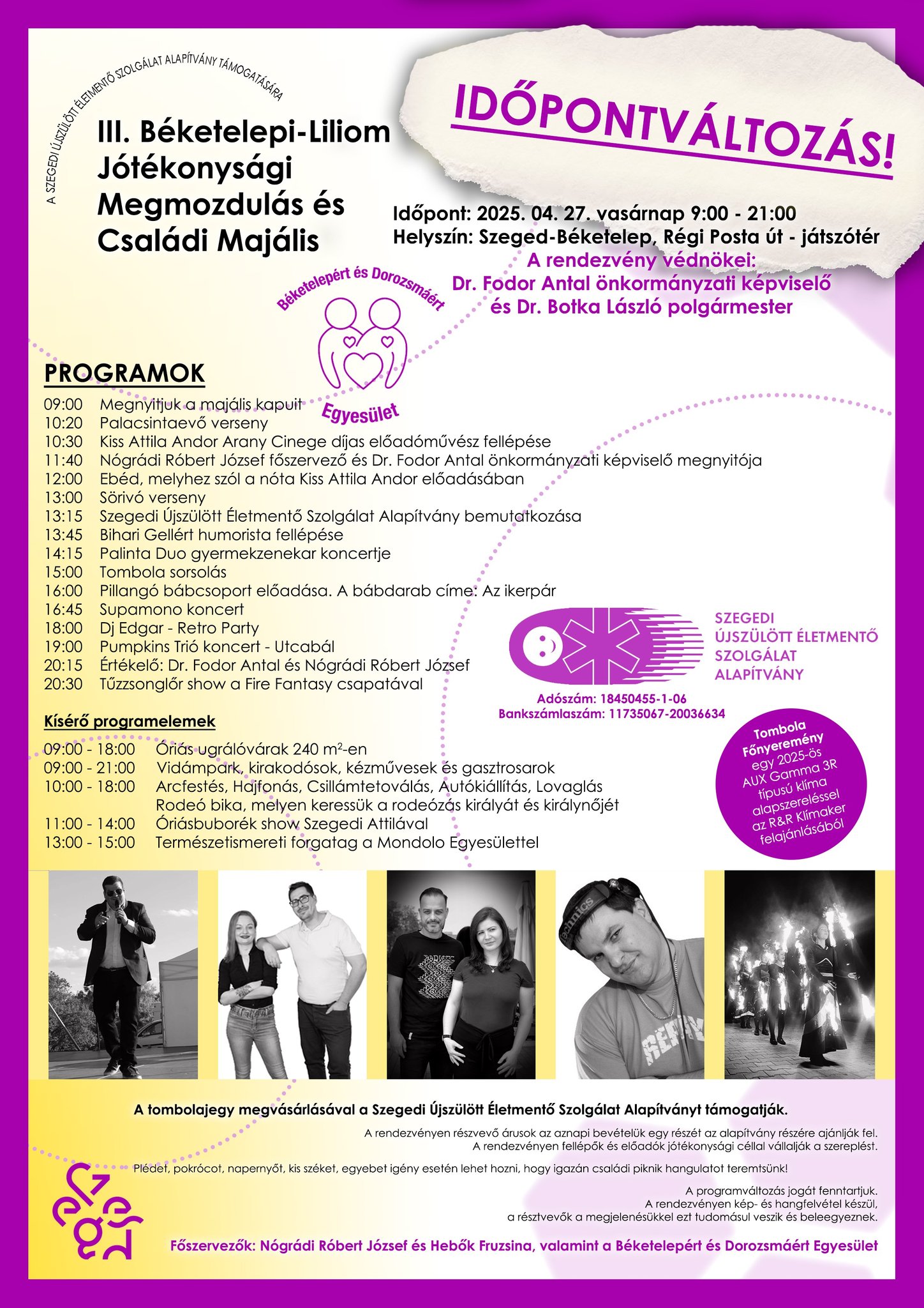 Az időpontváltozásra a Facebookon közzétett eseményben is felhívták a figyelmet. Programokból még így sem lesz hiány, és idén is a szórakozás mellett a jótékonyság kapja a főszerepet. Ezúttal a rendezvény bevételét a Szegedi Újszülött Életmentő Szolgálat Alapítványnak ajánlják fel.