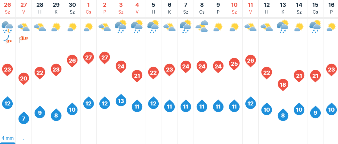 Szombaton többfelé kialakulhat eső, zápor, helyenként még zivatar is. Délutánra viszont megszűnik a csapadék, egyre szakadozottabbá válik a felhőzet. Élénk, erős lesz az északi, északkeleti szél. Délután 23 fok körül alakul a csúcshőmérséklet Szegeden.