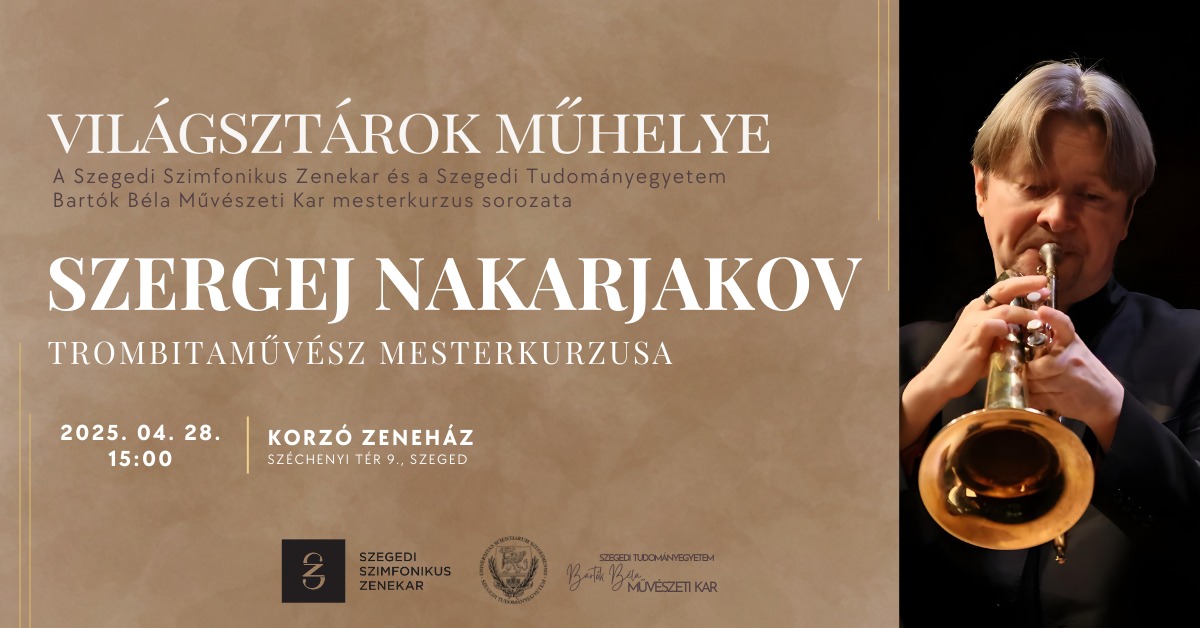 Április 29-én, kedden este koncertezik, előtte pedig az egyetem Bartók Béla Művészeti Kara hallgatói számára tart mini-mesterkurzust Sergei Nakariakov, a világ egyik legkeresettebb hangszeres szólistája, a trombita virtuóza.