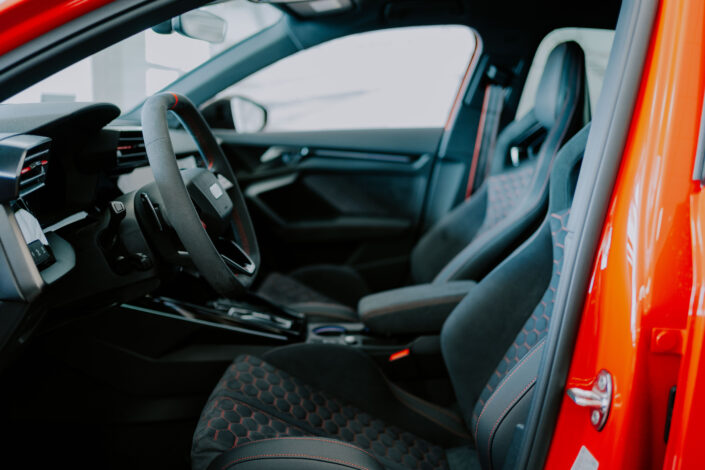 Az abszolút kedvencünk a következő tétel volt, ami nem más, mint a tűzpirosra fényezett, 400 lóerős Audi RS3, vagy ahogyan Nagy Lajos nevezte: a kis méregzsák. A kimondottan sportosra hangolt autóból nem maradt ki semmi, ami a sportos jellegre utal, köztük a