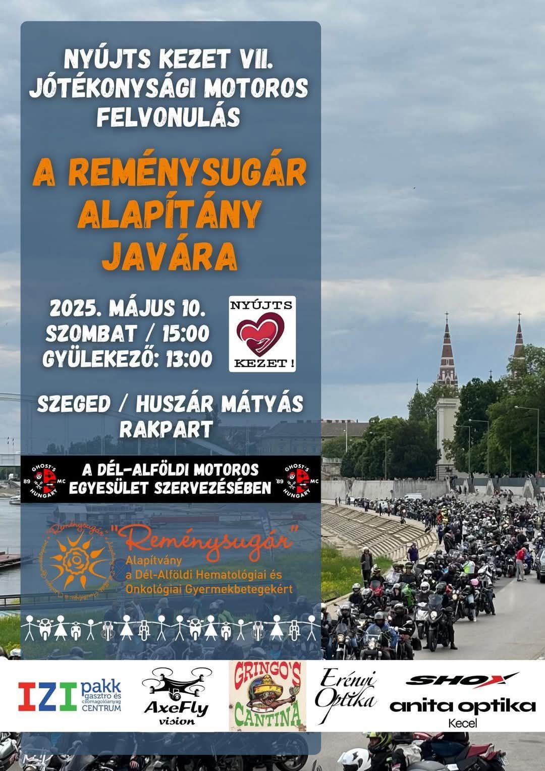 Már csak két nap, és aranyszívű bőrmellényes srácok, szuper különleges motorok és segíteni vágyó szegediek lepik el a Huszár Mátyás Rakpartot: szombaton kora délután kezdetét veszi az immáron hetedik alkalommal megrendezésre kerülő “Nyújts Kezet!” jótékonysági motoros felvonulás, amelynek teljes bevételét a Reménysugár Alapítvány kis hőseinek megsegítésére ajánlanak fel a szervezők.