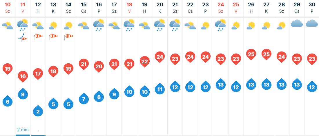 Vasárnap egy hidegfront érkezik, ami főként a reggeli, délelőtti órákban okozhat esőt, záporokat. Később felszakadozik a felhőzet, a délután második felében már a napsütés lesz túlsúlyban. Feltámad, helyenként megerősödik az északi-északkeleti szél. A maximumok 13 és 19 fok között alakulnak.