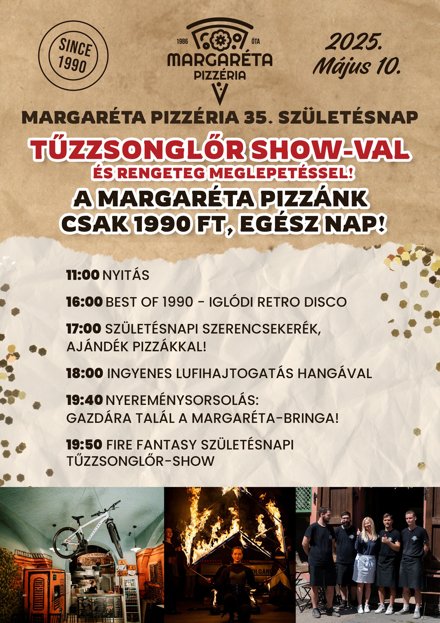 35 éves lett a Margaréta Pizzéria Szegeden! A neves ünnepre nagy durranással készülnek a Horváth Mihály utcai vendéglátósok, hiszen szombaton a lufihajtogatástól kezdve, a Tűzzsonglőr Show-n át a szerencsekerékig, minden adott lesz egy szuper kikapcsolódásra, no meg egy jó pizzázásra!