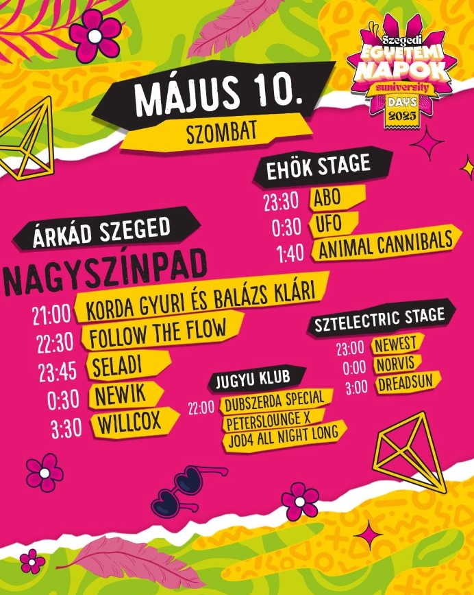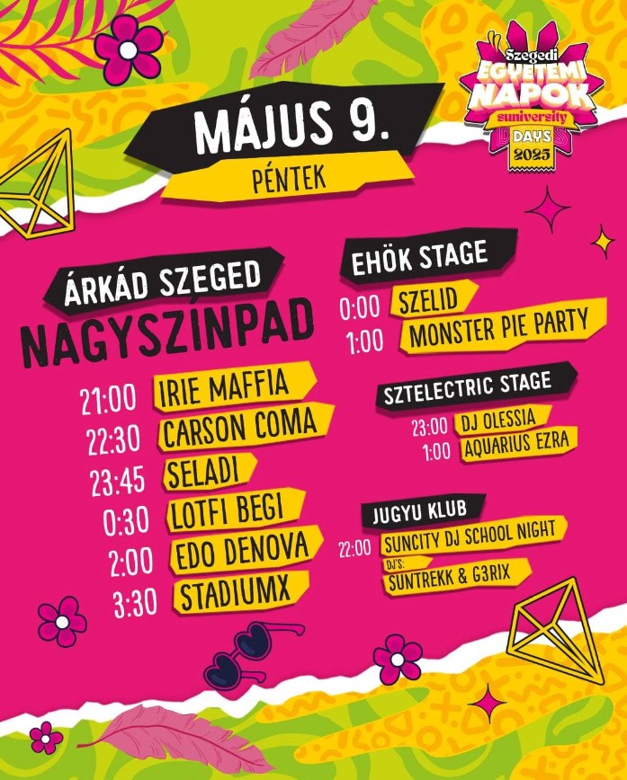 Az Egyetemi Tavasz mellett a fiatalokra fókuszáló Szegedi Egyetemi Napok, azaz a Suniversity Days is elstartolt a városunkban. Pénteken és szombaton is szuper koncertekkel készülnek a Hattyas soron! Íme pár tuti fellépő: