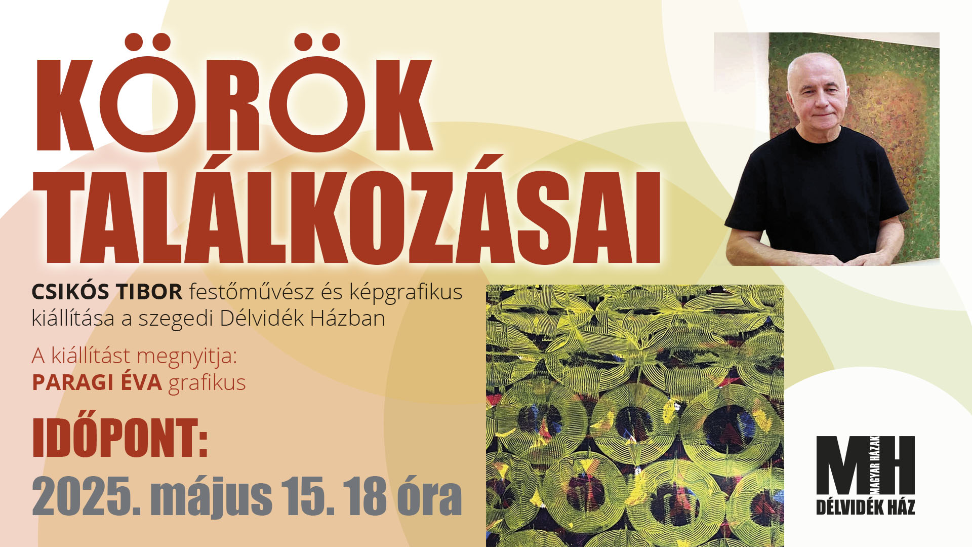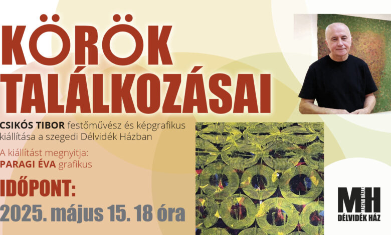 Csikós Tibor, a martonosi születésű, világszerte elismert festő- és grafikusművész május 15-én 18 órakor nyitja meg “Körök találkozásai” című kiállítását a szegedi Délvidék Házban. A tárlat egy különleges válogatás a művész festményeiből, grafikáiból és plasztikáiból, amelyeket erre az alkalomra állított össze. A megnyitón Paragi Éva grafikusművész méltatja a műveket, és a Premier Művészeti Szakgimnázium közreműködésével emelik az esemény ünnepélyességét. A kiállítás június közepéig látogatható munkaidőben.