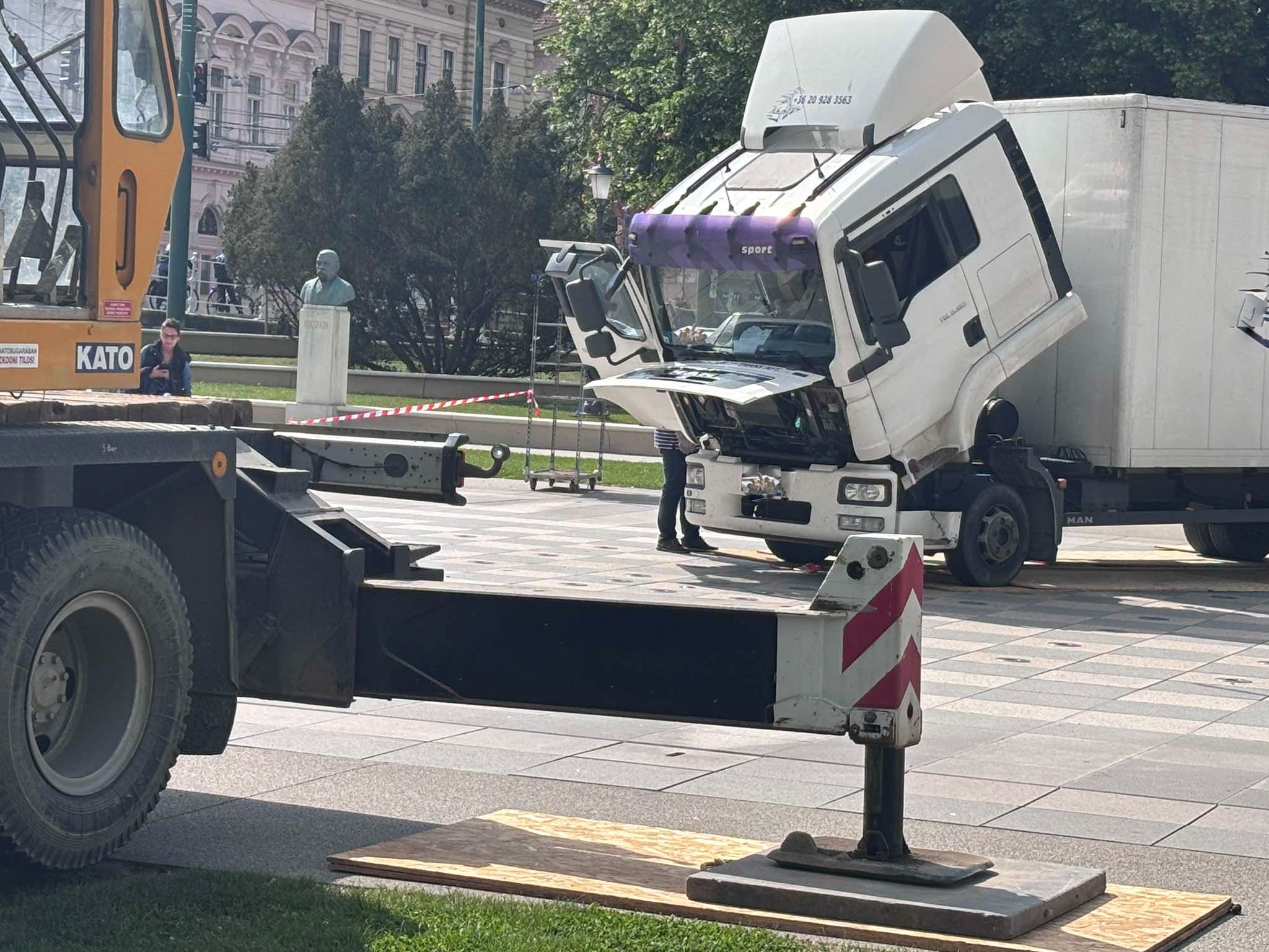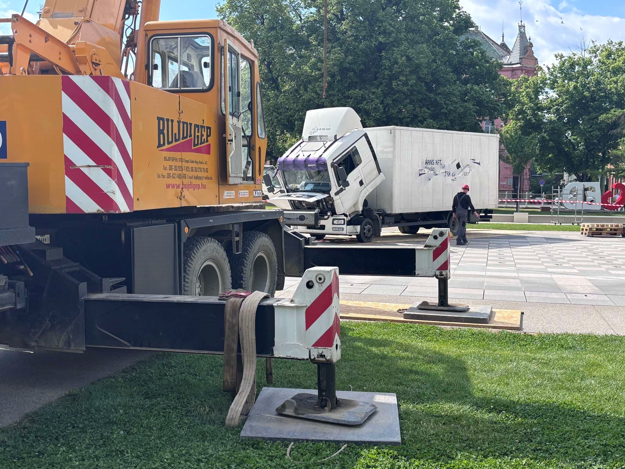 Daruval emelték ki a szökőkútba szakadt teherautót a Móra Ferenc Múzeumnál, tetemes lehet a kár