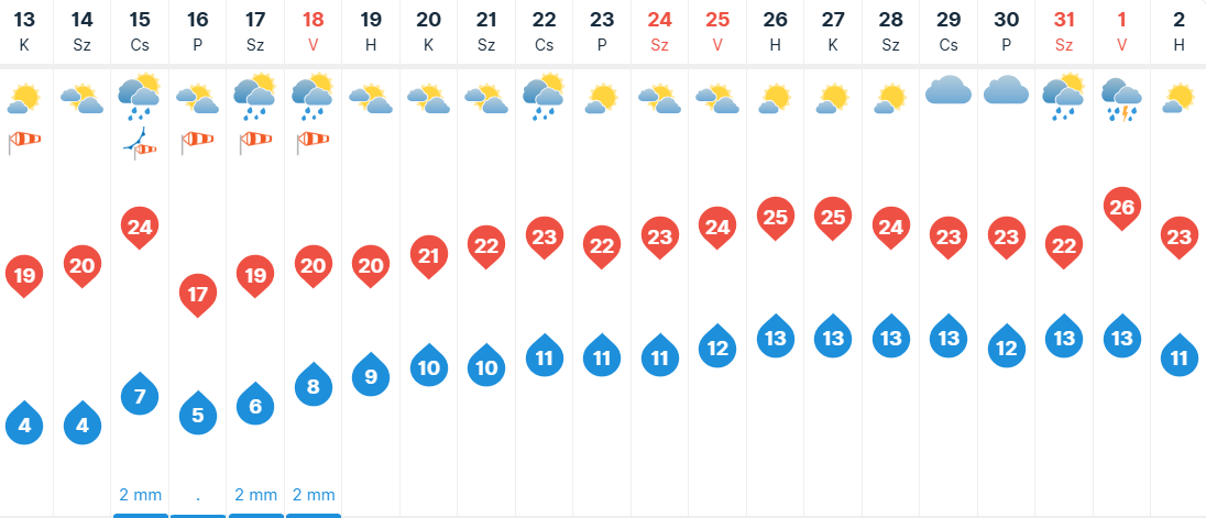 Szerdán napos, fátyol- és gomolyfelhőkkel tarkított időben lesz részünk, említésre méltó csapadék nem várható. Csak néhol élénkülhet meg a légmozgás. Gyenge fagy hajnalban elsősorban az északi fagyzugokban és a Nyírségben fordulhat elő. A maximumok 18 és 23 fok között alakulnak.