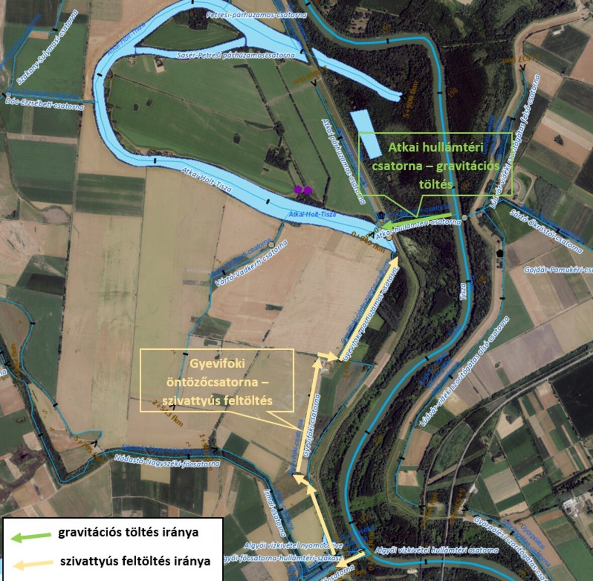 A holtág üzemi vízszintje az Atkai szivattyútelepnél lévő vízmércén mért +250 centimémteres vízállást jelenti. A holtág vízpótlása kétféle módon történhet, gravitációs úton a Tisza folyón levonuló árhullámok során a jobb parti elsőrendű árvízvédelmi töltés 36+397 tkm szelvényében lévő Atkai zsilipen keresztül, illetve szivattyúsan az Algyői fő vízkivétel – Algyői zsilip – Algyői főcsatorna – Gyevifoki táp- és öntözőcsatorna útvonalon át. Kiemelték, hogy a Tisza folyón 2025. március hónapban levonult árhullám során a holtág vízpótlását az Atkai zsilip nyitásával valósították meg, melynek során +135 cm induló vízállásról +155 cm vízszintet tudtak elérni. A zsilip 2025. március 19-én 15:00 órakor került nyitásra és március 26-án 06:00 órakor zárták le a vízbeáramlás megszűnését – árhullám levonulását – követően. A zsilip állandó felügyelet mellett folyamatosan, napi 24 órában nyitott állásban volt. Az így kialakult vízszint a holtágban azonban még mindig az üzemi vízszint alatt volt közel 1 méterrel.