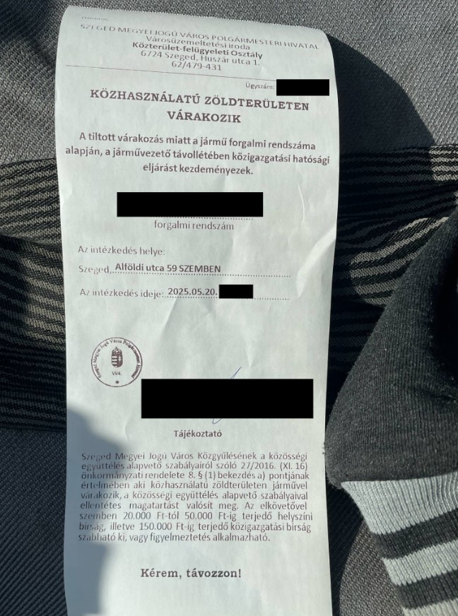 Az általa kapott büntetőcédulán az áll, hogy az önkormányzati rendelet szerint az, aki zöldterületen járművével várakozik, a közösségi együttélés alapvető szabályaival ellentétes magatartást valósít meg, 20 ezer forinttól 50 ezer forintig terjedő helyszíni bírság, illetve 150 ezer forintos közigazgatási bírság is járhat érte, de akár csak figyelmeztethetik is az autó tulajdonosát. Az utóbbi időben egyébként nem csak itt fordult elő hasonló eset. Újszegeden is egyre többször büntetik meg azokat, akik zöldterületen parkolnak. Ott is, ahol egyébként korábban nem igazán volt jellemző, hogy bírságol a Közterület-felügyelet. Bízunk benne, hogy ebben az esetben is csak figyelmeztetés lesz az ügy kimenetele.