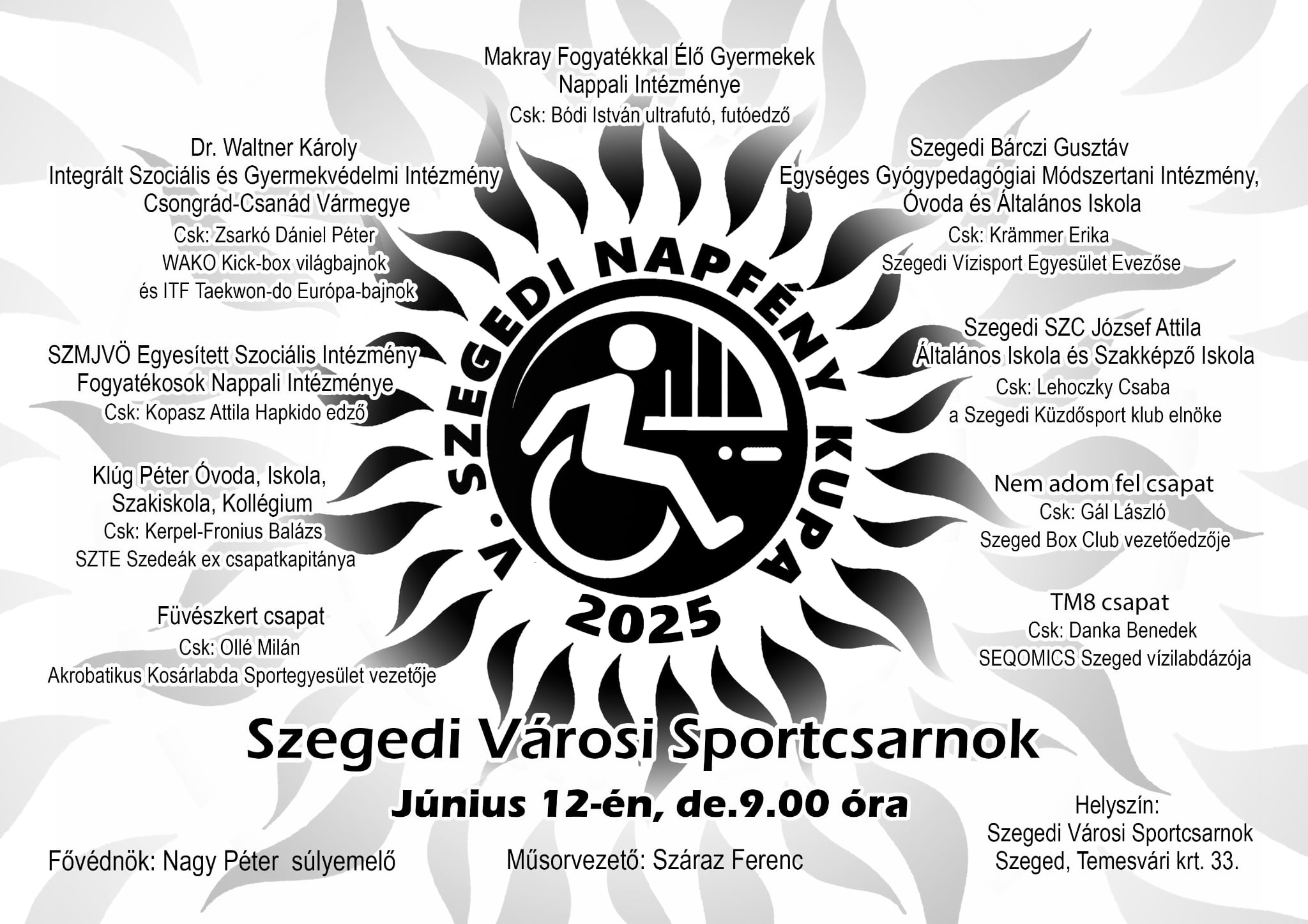 A Szegedi Mozgássérültek Alternatív Egyesülete immáron ötödik éve rendezi meg 2025. június 12-én az 5. Napfény Kupa sportrendezvényt a Szegedi Városi Sportcsarnokban. Ezen a napon 9 szegedi intézmény sérült fiataljai sportolnak majd együtt kilenc szegedi sportolóval.