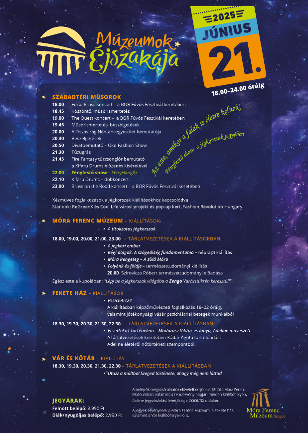 Izgalmas programokkal várja az érdeklődőket a Móra Ferenc Múzeum az idei Múzeumok Éjszakáján június 21-én. Mint az intézménytől megtudtuk, most először láthatunk fényfestő showt a Kultúrpalota homlokzatán, emellett Öko Fashion divatbemutatóval, tűzzsonglőrökkel és a jégkorszak-kiállítás második egységével is találkozhatnak a résztvevők.