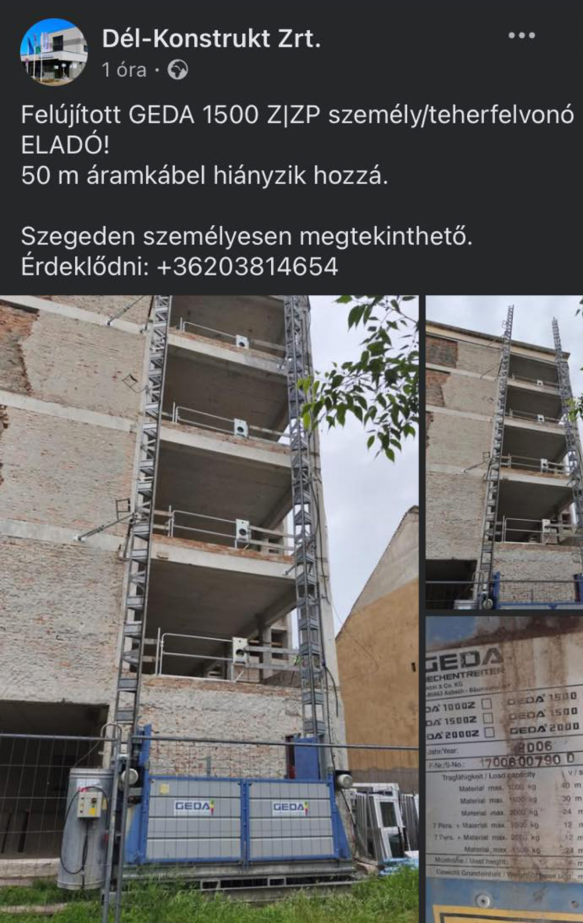A Szeged365 Family tagjai ma friss fotókkal és videókkal bombázták szerkesztőségünket: a helyszíni táblák eltűntek, a kivitelezőre utaló jelek megszűntek, az építkezés áll – sőt, ami a legmegdöbbentőbb – az egyik személy- és teherfelvonót, egy felújított GEDA 1500 Z/ZP-t árulnak nyíltan egy Facebook-posztban. A lift ugyan megtekinthető Szegeden, de az 50 méteres áramkábel hiányzik belőle. Ez nem a visszatérés, hanem a vég kezdete – legalábbis sokak szerint.