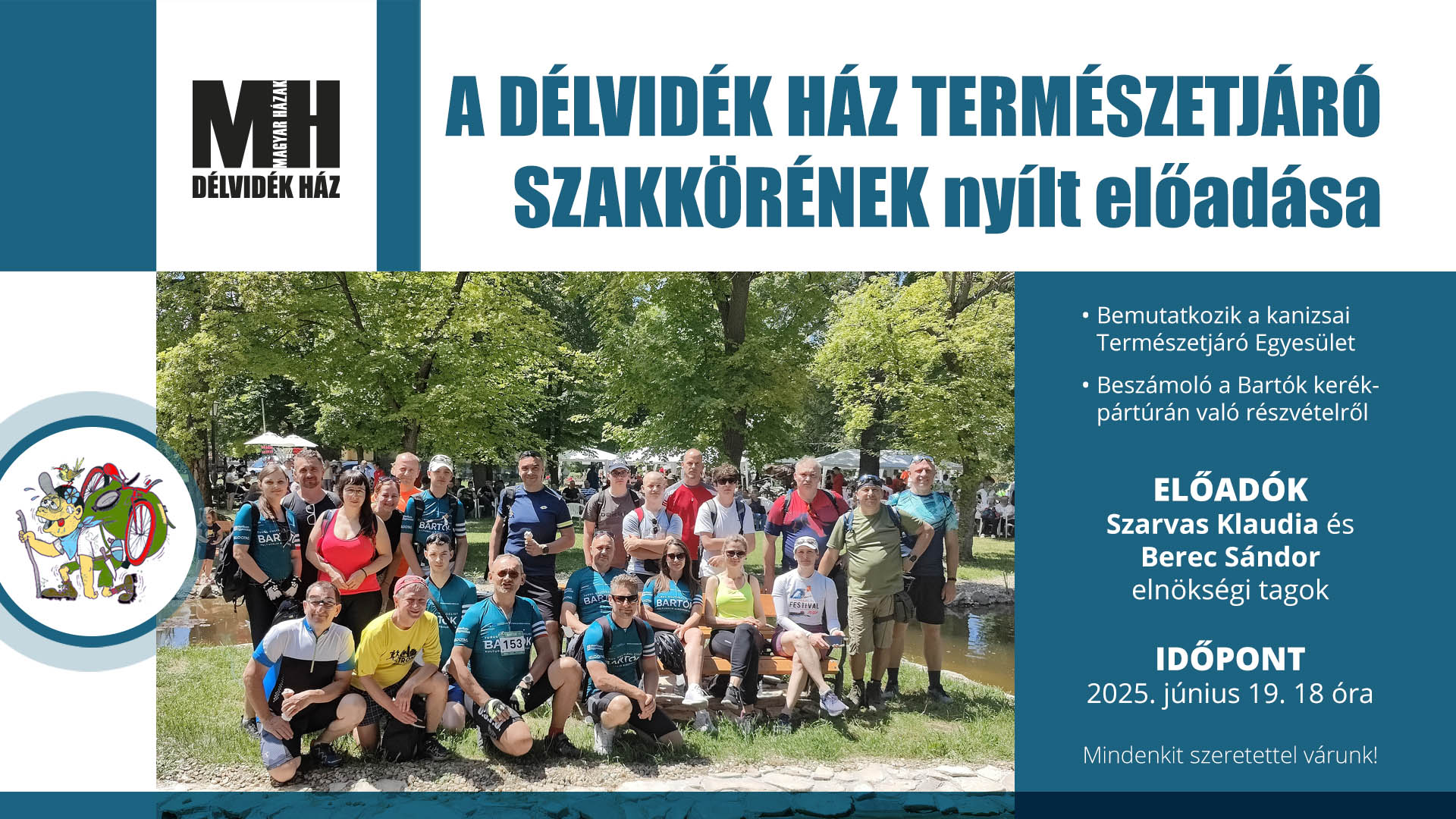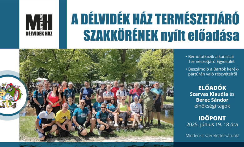 A Délvidék Ház június 19-én 18 órától különleges eseménynek ad otthont: bemutatkozik a magyarkanizsai Természetjáró Egyesület. Az előadáson Szarvas Klaudia és Berec Sándor elnökségi tagok mesélnek a Bartók kerékpártúrán szerzett élményeikről, valamint az egyesület év második felére tervezett programjairól. Az esemény minden természetkedvelő és közösségi program iránt érdeklődő számára nyitott.
