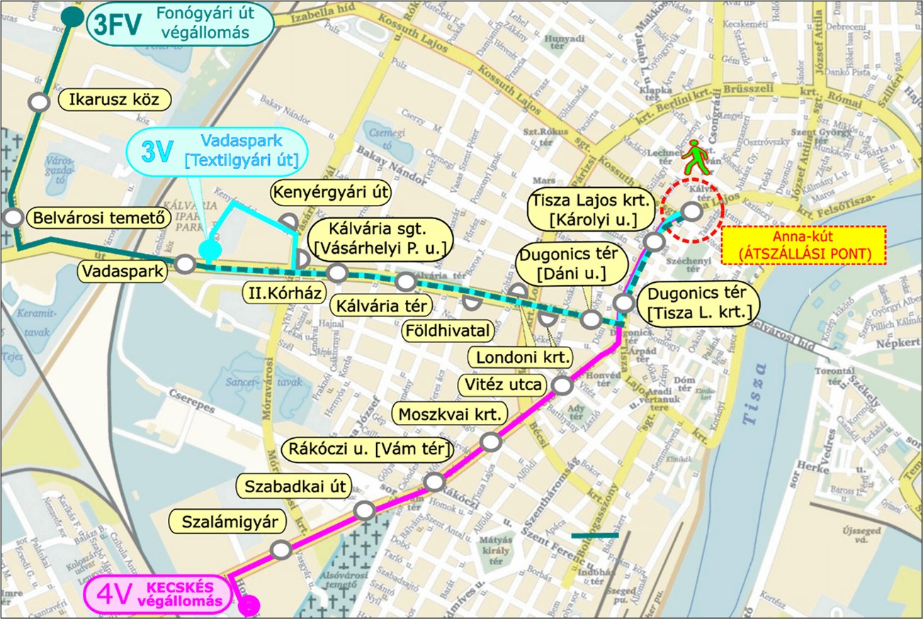 A 8-as és 10-es trolikat, és a MÁV Személyszállítás Zrt. autóbuszait, a 20-as és 24-es járatot is érinti a változás. Az SZKZ azt írja, hogy a gördülékenyebb közlekedés érdekében a munkálatok ideje alatt 2025. augusztus 17-ig „8” és „10” jelzésű trolibuszok Szent István tér irányban a Tisza Lajos krt.-i szélső megállóhelyet használják, valamint 2025. június 23-tól tervezetten 2025. július 2-ig a MÁV Személyszállítási Zrt. által közlekedtetett autóbuszok a Dugonics tér irányban az Anna-kút [Tisza Lajos krt.] megállóhely helyett a régi Kálvin téri autóbusz megállóhelyet, valamint Glattfelder Gyula tér irányban a Tisza Lajos krt.-i szélső megállóhelyet használják.