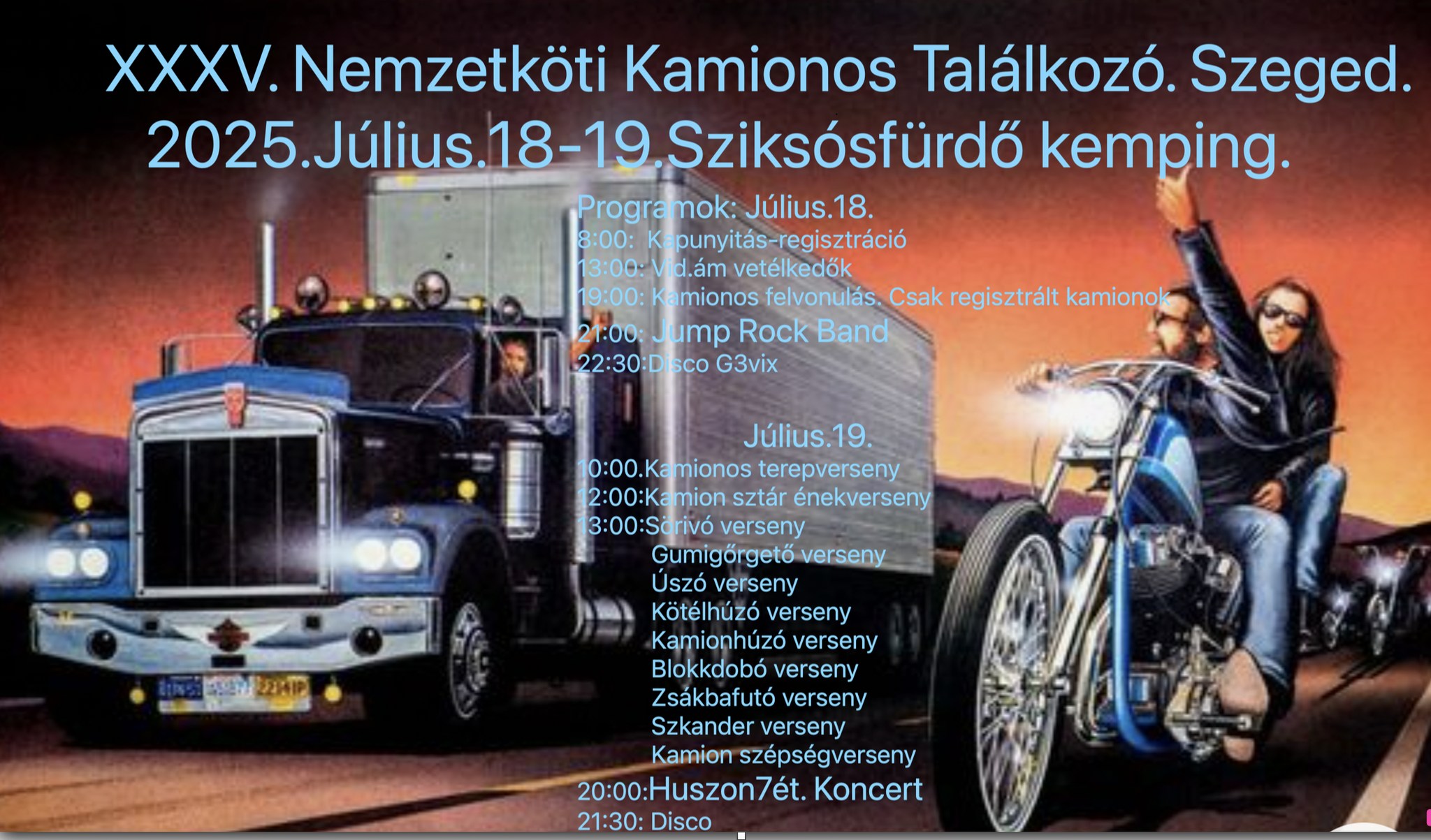 “Készülj fel egy felejthetetlen hétvégére, ahol a hatalmas gépek és a jó hangulat garantált! A Szegedi Kamionos Találkozó rengeteg izgalmas programmal vár minden érdeklődőt és persze a kamionosokat. A kemping adottságainak köszönhetően fürdési lehetőség is biztosított a helyszínen, ráadásul vidámpark, széles étel- és italkínálat gondoskodik a felhőtlen szórakozásról és a kulináris élvezetekről”