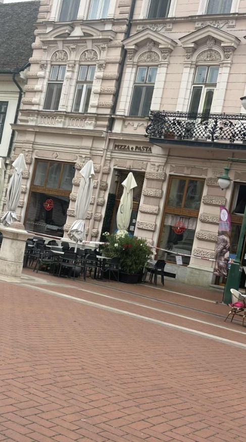 Az étterem előtt a teraszt is lezárták és arra figyelmeztetnek, hogy mindenki vigyázzon, mert a tetőn munkálatok zajlanak.