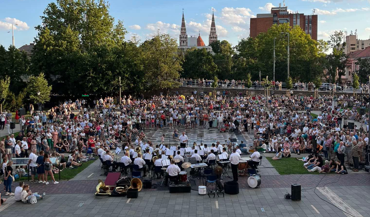 A 2025. JÚLIUS 19-I KONCERT az idei nyári szezon egyik legnagyobb szabadtéri fúvószenei eseménye volt Szegeden. A zenekart ezúttal is GÖMÖRI BALÁZS ŐRNAGY vezényelte, és olyan ismert dallamokat szólaltattak meg, mint a SZÉP VÁROS KOLOZSVÁR, filmzenék, könnyűzenei klasszikusok, sőt: operaáriák is felcsendültek. A koncertre érkezők nemcsak hallgatták, de együtt énekelték a legismertebb dallamokat, a Móra-park teljes egészében megtelt, a szökőkút körül pokrócokon, fűben ülve, padokon állva hallgatták végig a műsort.