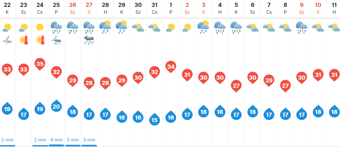 Szerdán gomoly- és fátyolfehők leszenk felettünk, de sok napsütés várható. Záporok legfeljebb a nyugati határ térségében fordulhatnak elő. A nyugatias szelet az északi országrészben kísérhetik élénk lökések, máshol mérsékelt lesz a légmozgás. Napközben 30-35 fok mérhetünk.