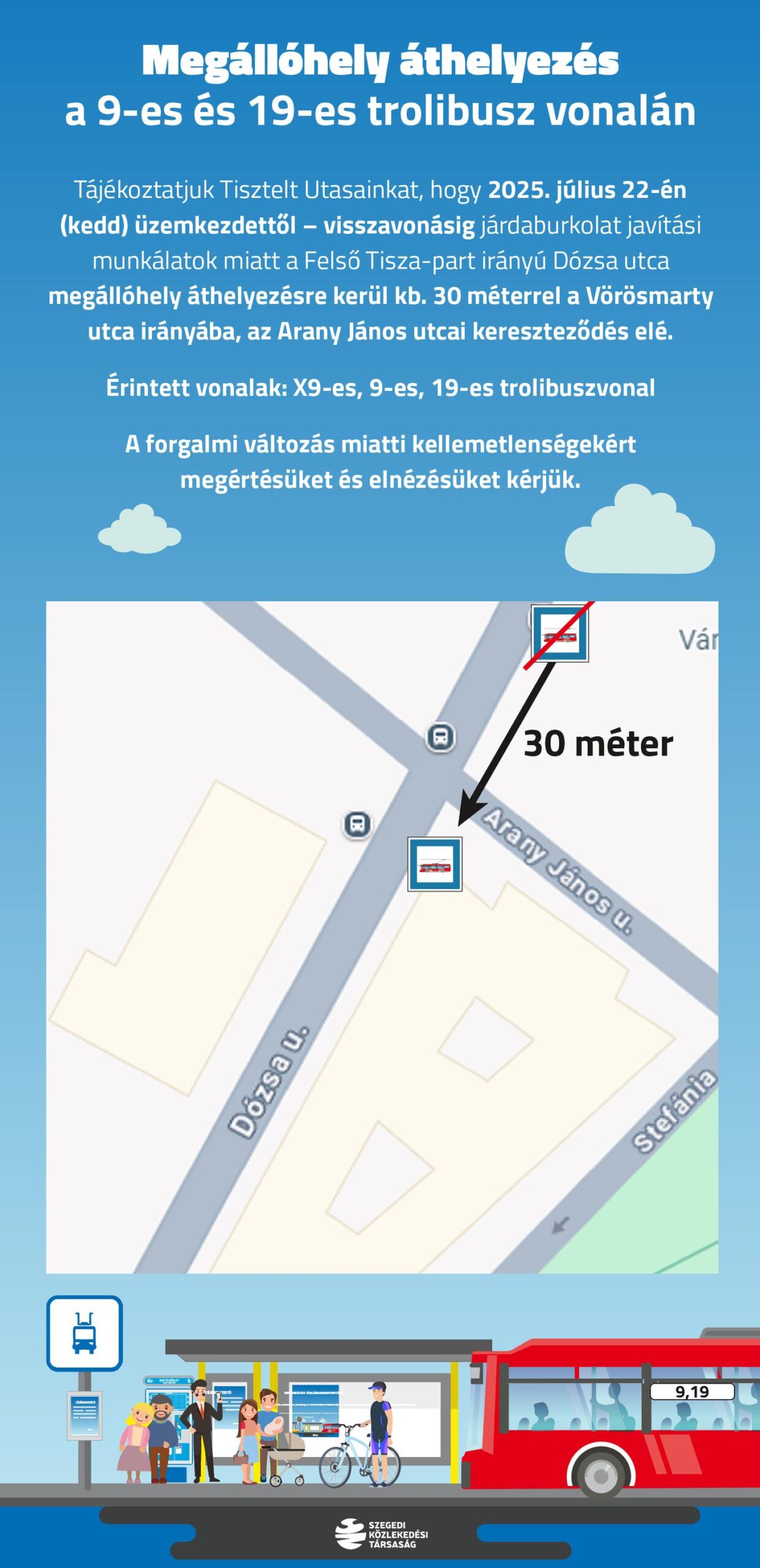 A Felső Tisza-part irányú Dózsa utca megállóhelyet áthelyezik körülbelül 30 méterrel a Vörösmarty utca irányába, az Arany János utcai kereszteződés elé – írja az SZKT.