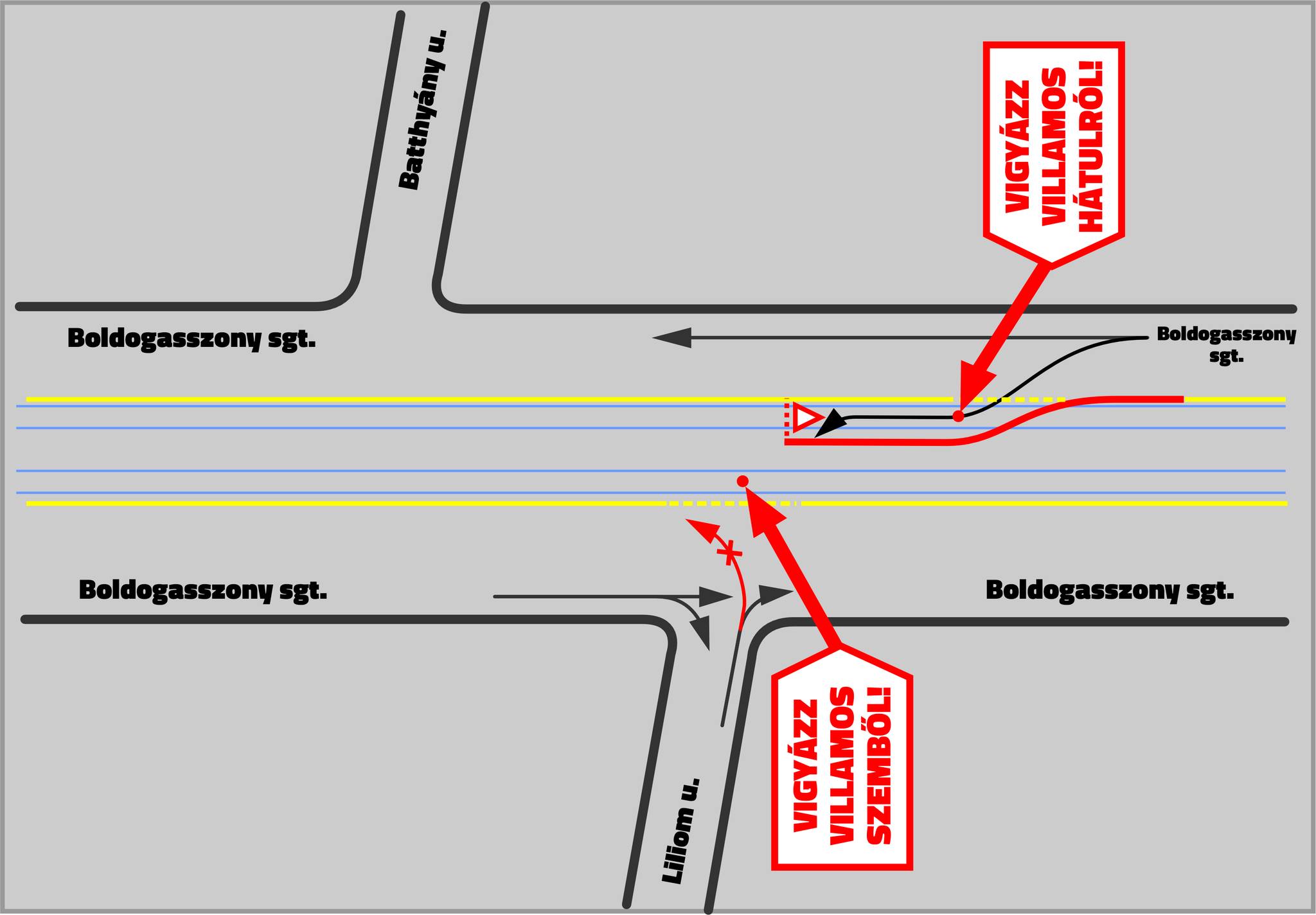 Kiemelték, hogy a Liliom utcánál kettéválasztásra került a villamospályára ráhaladás és a balra kanyarodás művelete, így reményeik szerint az autósok figyelme kevésbé oszlik meg, ami megelőzheti a baleseteket. Felhívják a figyelmet arra, hogy a villamospályára rásorolásnál a KRESZ szerint a villamosnak van elsőbbsége.