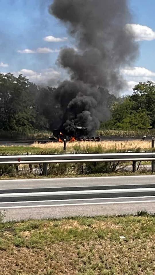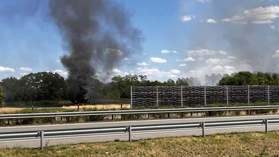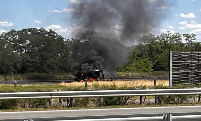 Teljesen kiégett egy kombájn M5-ös mellett Csongrád-Csanádban, a tűz a gép környezetét is leégette (frissítve)