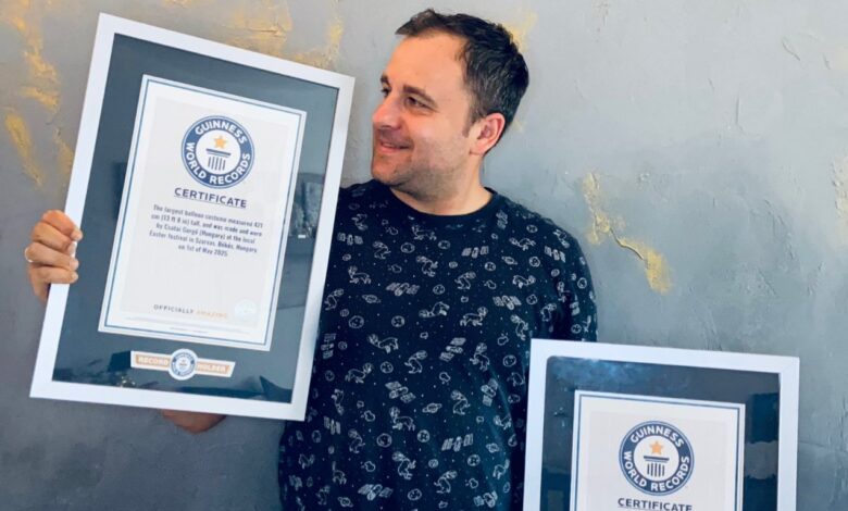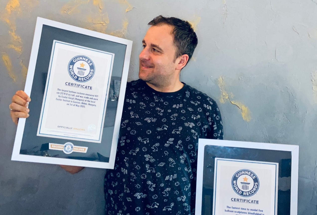 “Május elsején, szülővárosomban, Szarvason készült el, a Liget Wellness és Konferencia Hotel**** rendezvény házában. Innen is köszönöm nekik a sok segítséget, és azt a baráti kedvességet, amivel segítettek és helyszínt biztosítottak. Ezzel együtt nekem már a MÁSODIK Világrekord oklevelem, így lettem: KÉTSZERES GUINNESS REKORDER lufihajtogató” – írta hétfőn a közösségi oldalán Csatai Gergő.