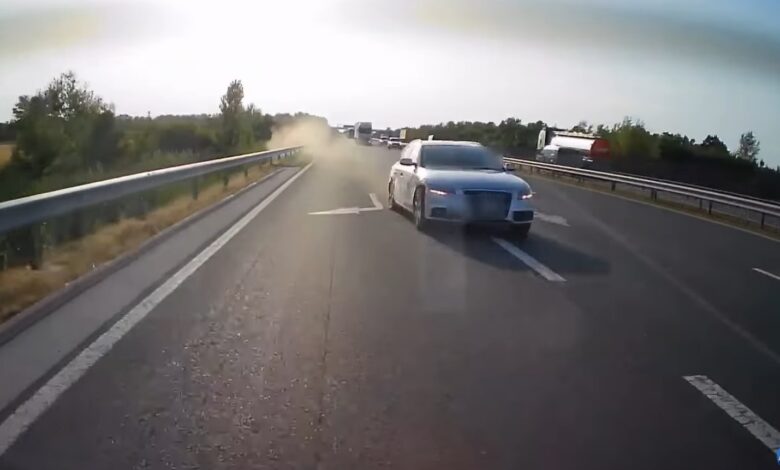 Videón, ahogy egy Audis szalagkorlátról szalagkorlátra csapódik, majd egy autószállító trélernek rohan az M43-ason, Makó felé