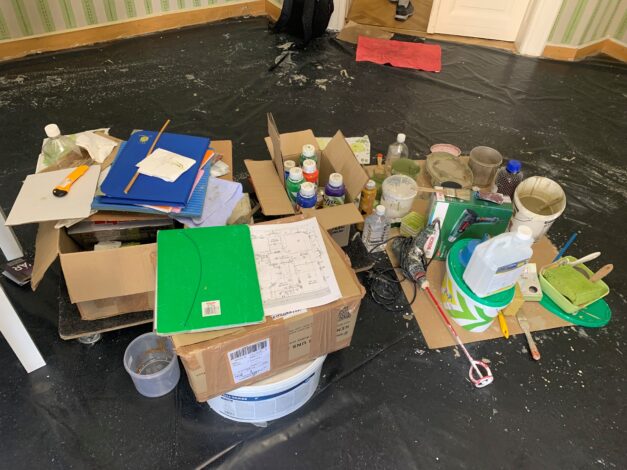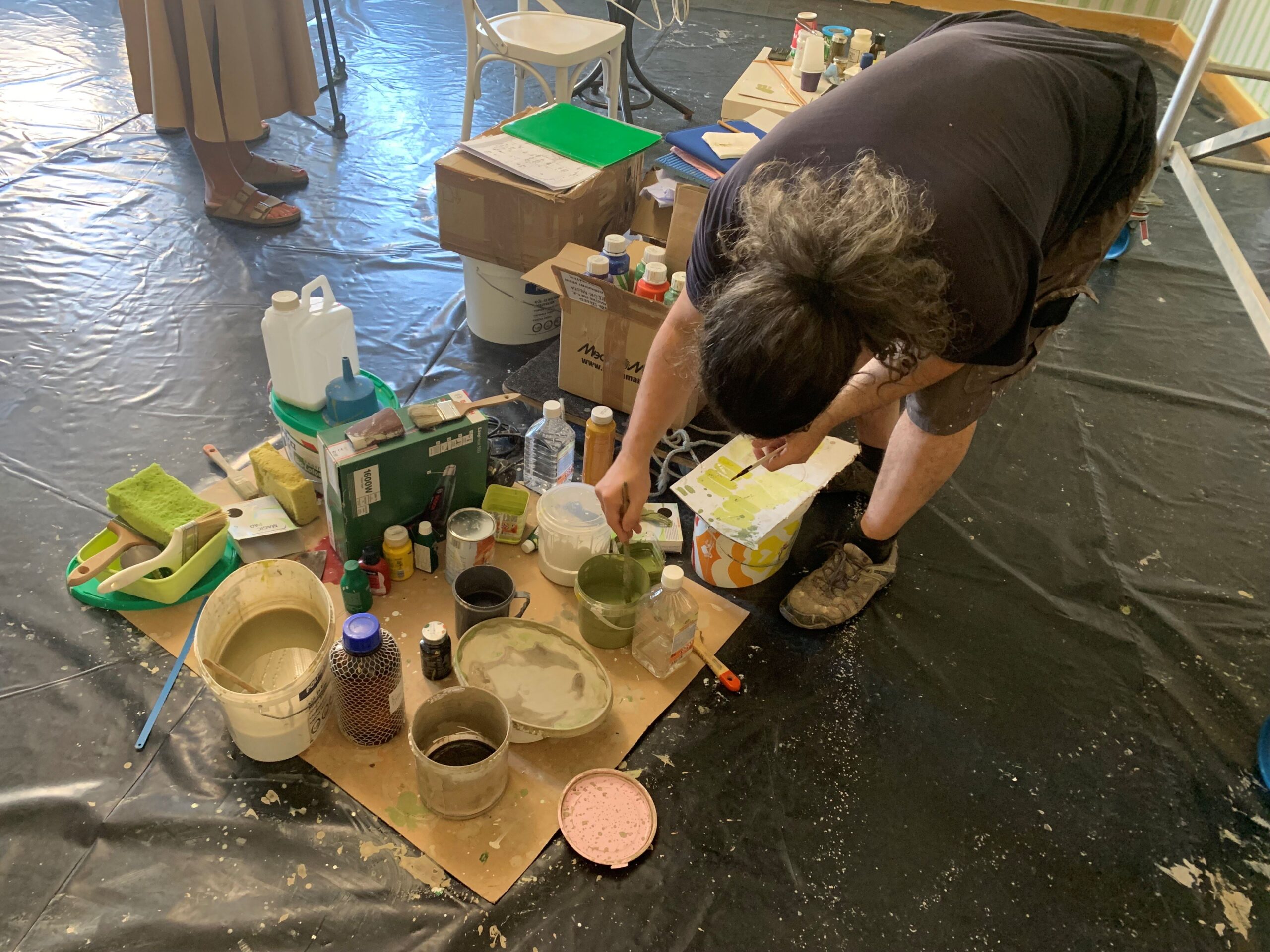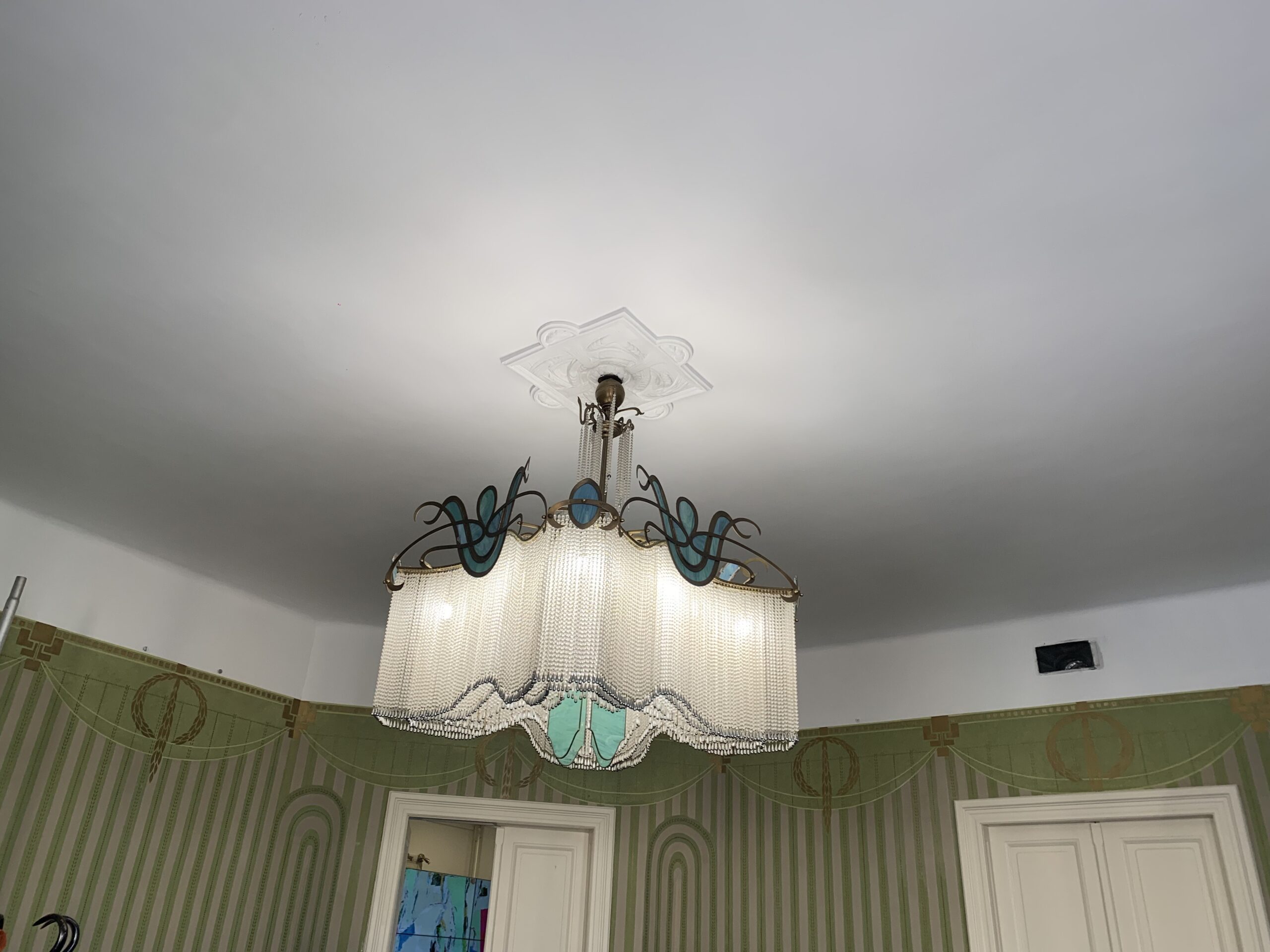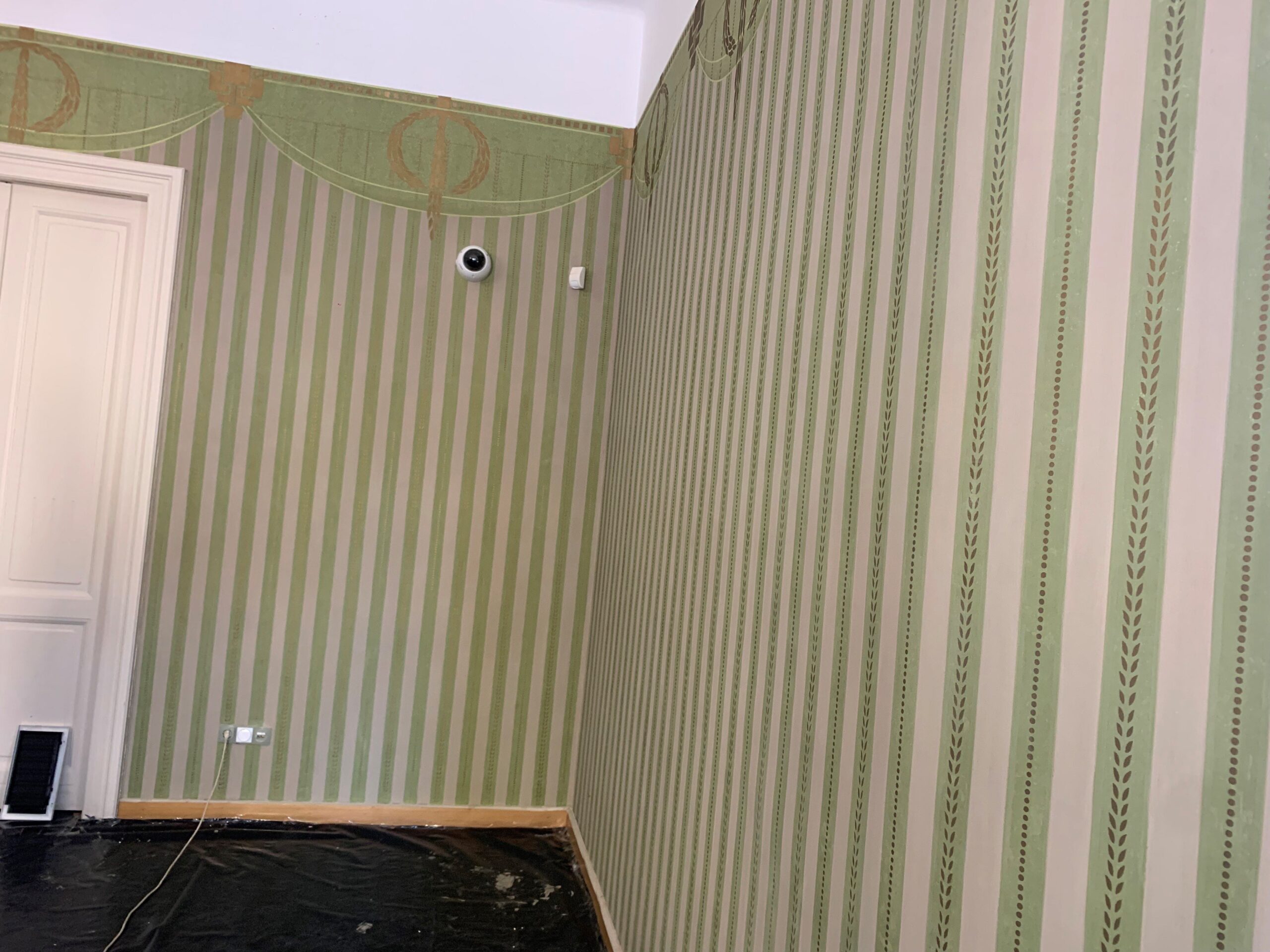 ,,Az épület kutatását két kolléganőm kezdte 18 évvel ezelőtt, rengeteg festék nyomot találtak, a Zöld-szalon volt az egyetlen terem ahonnan értékelhető nyomok kerültek elő. Szoktuk mondani, hogy a lusta kőműves a legjobb barátunk, hiszen néha amikor rombolnak, akkor őriznek is meg belőle valamit. A teremben a közfalakon minden 5. sor volt bekötve, ezeken maradt meg a mögöttük lévő vakolat. A dél-nyugati sarokrész az eredeti formájában megmaradt, a terem további része a megmaradt nyomok alapján restaurálható. Jelenleg a rekonstruálás rekonstruálása zajlik, hiszen az elmúlt 18 évben rengeteg sérülés keletkezett” – fogalmazott Kisterenyei Ervin. A festő-restaurátor művésztől megtudtuk, a munkálatok egy különleges, egyedi kazeines festékkel zajlanak, a falakat nyugalommal és türelemmel, 2-es és 3-as méretű ecsetekkel végzik. ,,Nagyon fontosnak tartjuk, hogy helyre lehetett állítani, hiszen a plasztikai dolgok kivételével az évek alatt minden elpusztult” – zárta mondandóját a munkálatokat vezető művész.